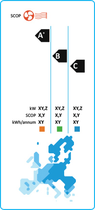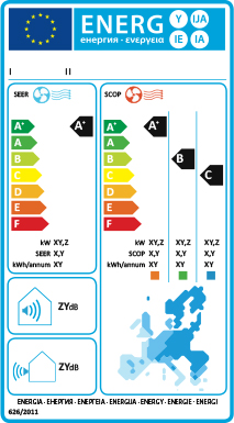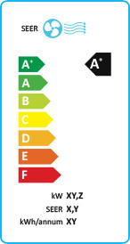 Energieffektivitetsklassen för luftkonditionering visas på en skala från A+++ till G, där A+++ är effektivast. Säsongsköldfaktorn för luftkonditionering förkortas SEER, efter den engelska beteckningen, "Seasonal Energy Efficiency Ratio"